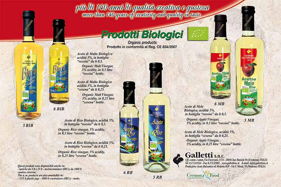 Più di 140 anni di qualità creativa e gustosa: aceti di Malto biologici, aceti di Riso biologici, aceti di Mele biologici.
